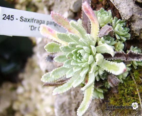 C’est une plante rocheuse formant du gazon et forme un coussin de petites rosettes à feuilles aux feuilles gris-vert.