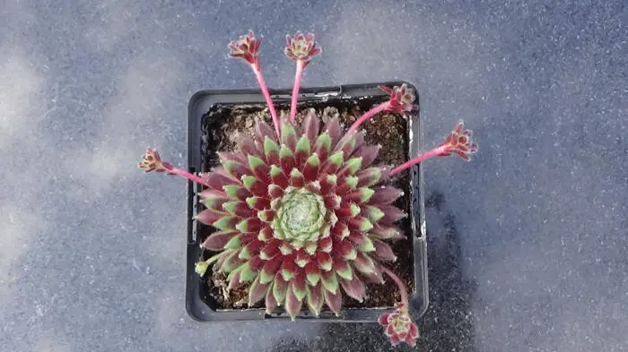 Fleurs sur une tige haute (12 cm) avec des fleurs rose vif en forme d’étoile. Après la floraison, les rosettes meurent mais sont remplacées par de nouvelles pousses.