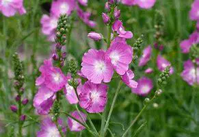 Sidalcea 'Rosanna' présente une croissance dressée et des feuilles profondément lobulées et vertes.