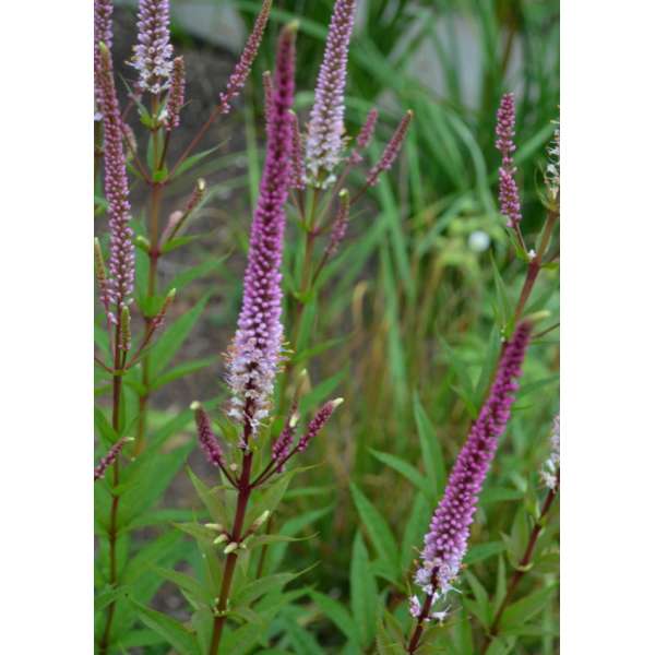 Veronicastrum virginicum 'Erika' est une plante touffue et robuste avec de longues épines bien ramifiées sur tiges sombres. Le dégradé de couleur des bourgeons violets et des fleurs rose pâle est particulièrement beau.