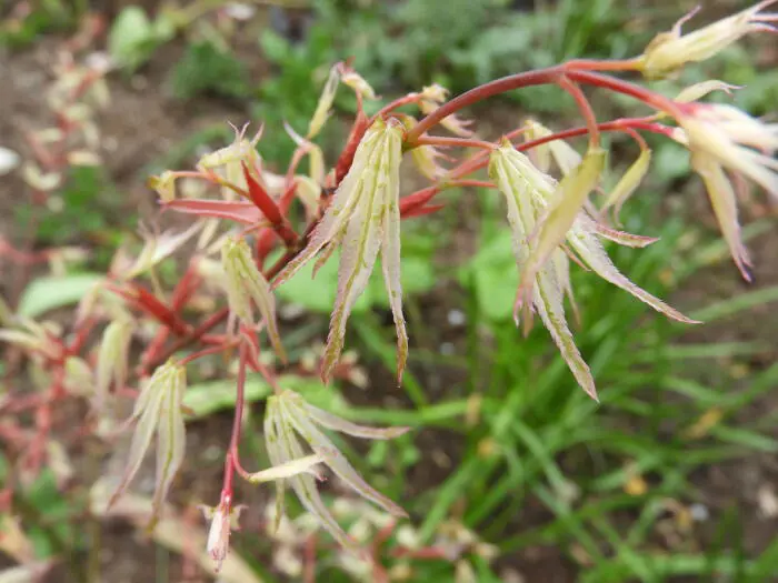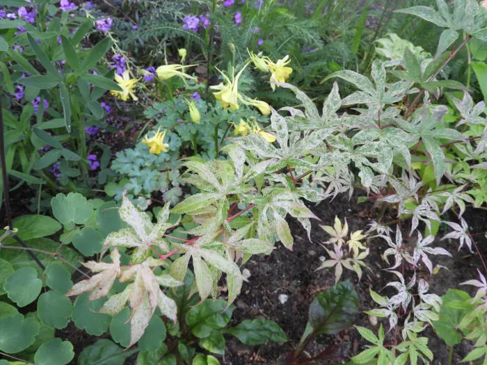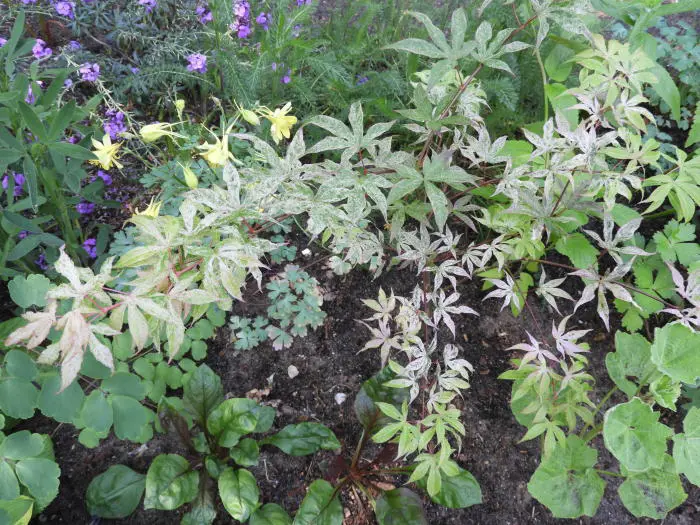 Acer palmatum 'Ukigumo' possède des feuilles attrayantes et marquantes. Les feuilles sont tachetées de blanc et de roseÇa grandit très lentement.Ne tolère pas le soleil éclatant.