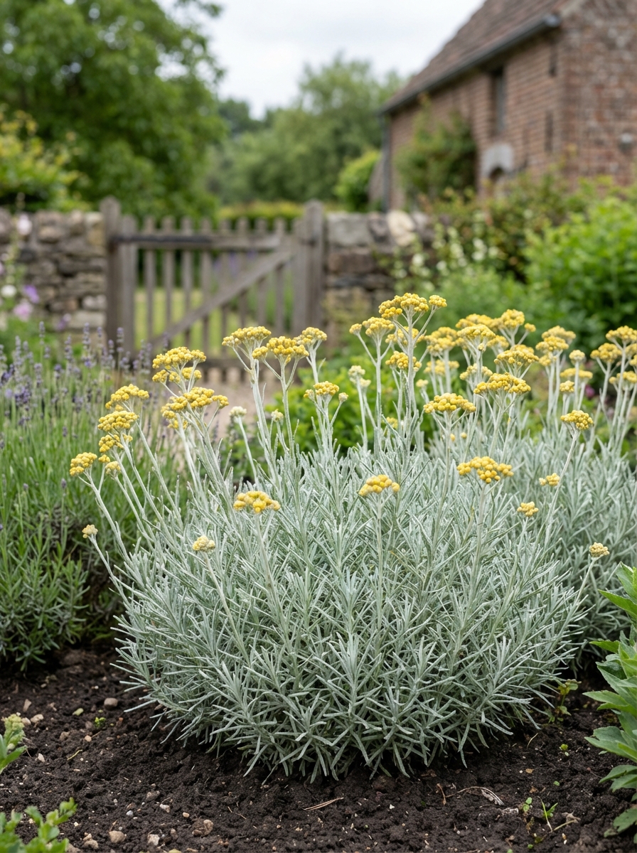 Helichrysum italicum subsp. serotinum est un semi-arbuste originaire d’Europe du Sud aux feuilles finement poilues, grises en forme d’aiguille. La feuille aromatique sent fortement le curry.