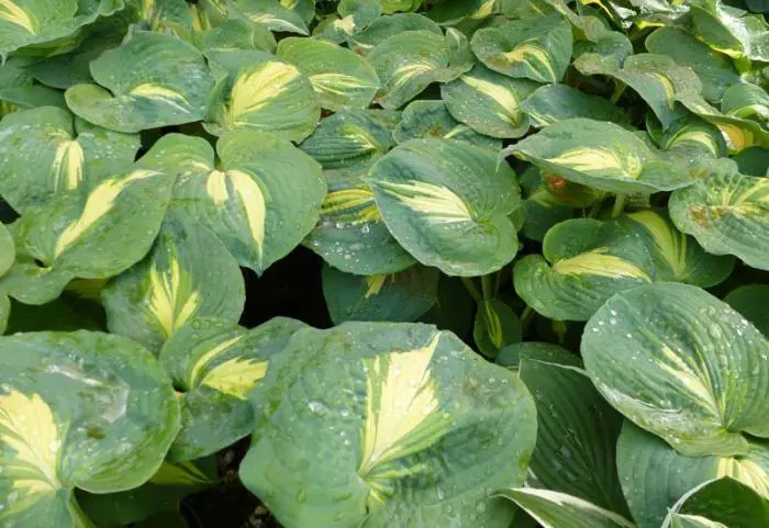Hosta 'Thunderbolt' possède des feuilles bleues rondes très robustes avec un centre jaune.