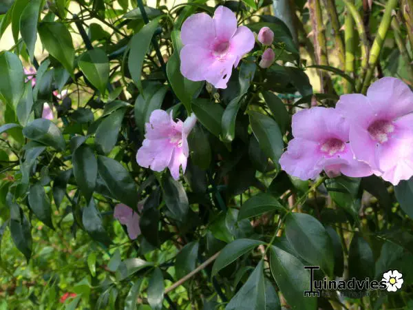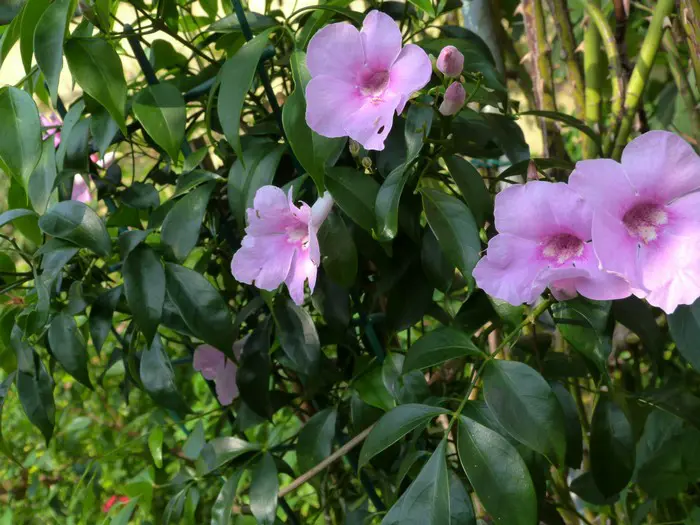 Les fleurs de la Pandorea jasminoides 'Rosea' fleurissent d’un rose pâle avec une gorge plus foncée.