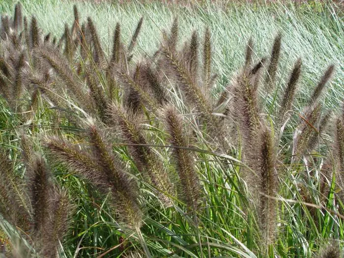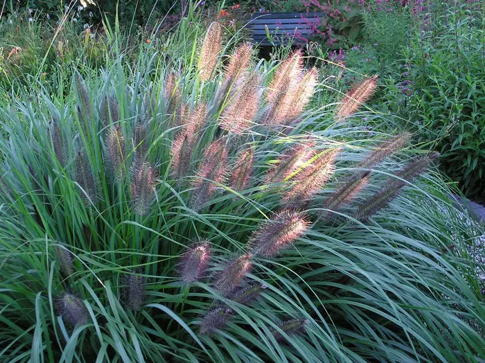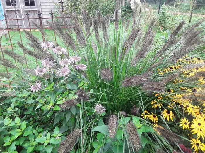 Pennisetum viridescens présente des plumes gris très foncé/brun-rosâtre et crée une belle silhouette en hiver.