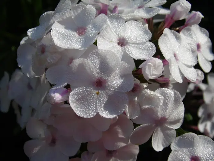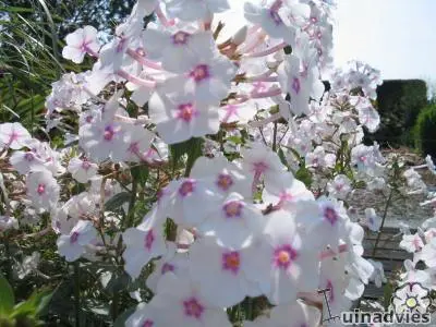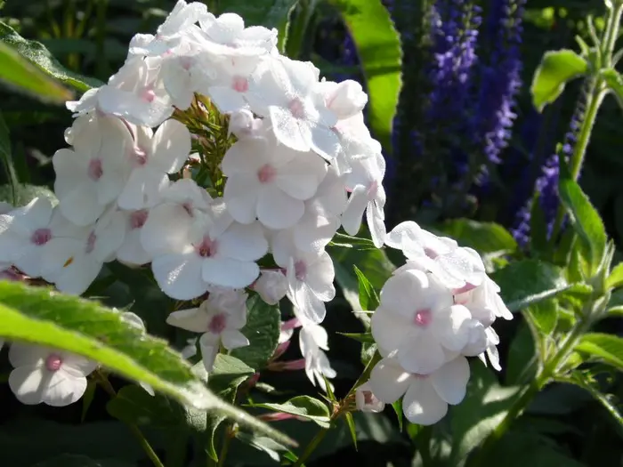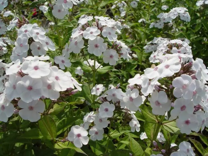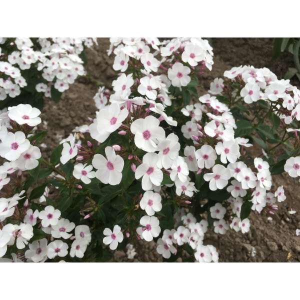 Phlox × arendsii PERLE de printemps 'Miss Jill' fleurit avec des fleurs plus petites. Les fleurs sont blanches avec un œil lilas.