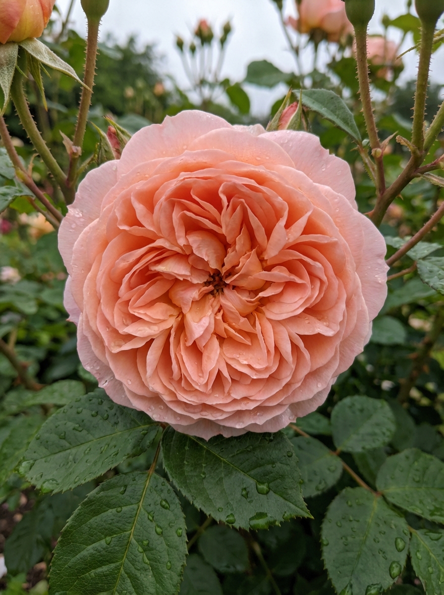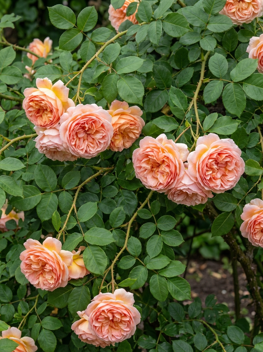 Rosa 'Abraham Darby' est une rose bien fleurie, (presque) sans épines, avec de grandes fleurs en forme de coupe (11 cm).