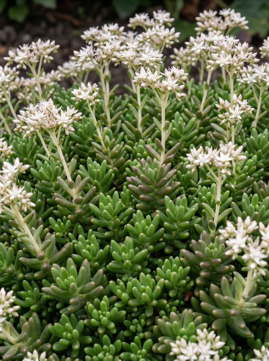 La culture de pierre blanche est un couvre-sol persistant pour les jardins de pierres, les murs ou les bols de plantes.Les fleurs blanc-roses sont très nombreuses et les feuilles charnues brun-rougeâtres sont dentelées et lancéolées.