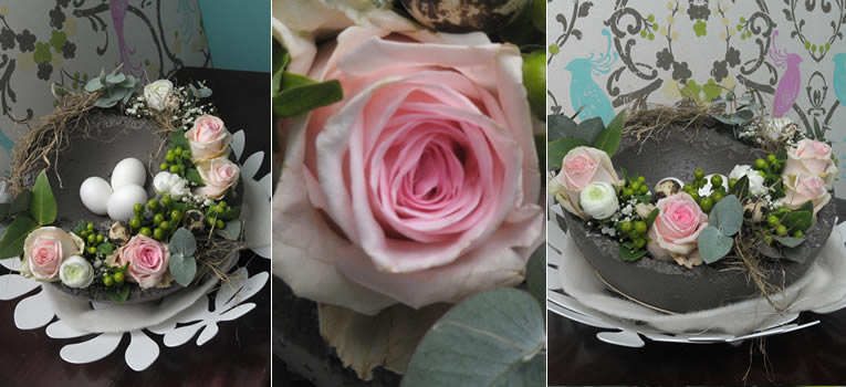 - Maak een mooie schikking met de bloemen, het groenmateriaal en het zeegras. Versier de bollen verder met kwarteleieren en kippeneieren zodat het net een vogelnestje lijkt.