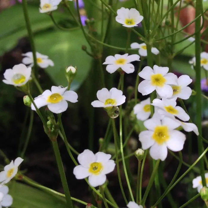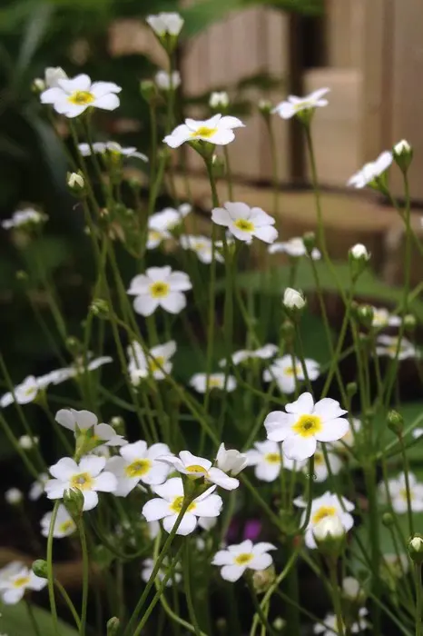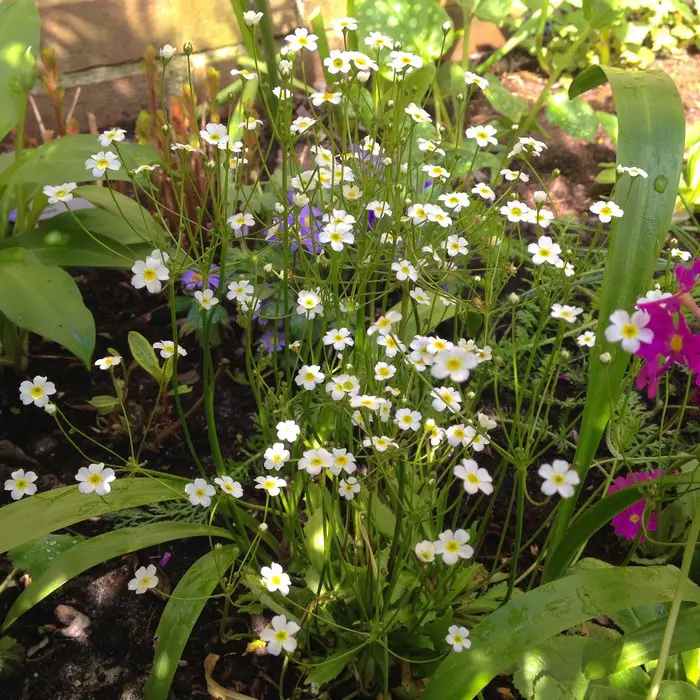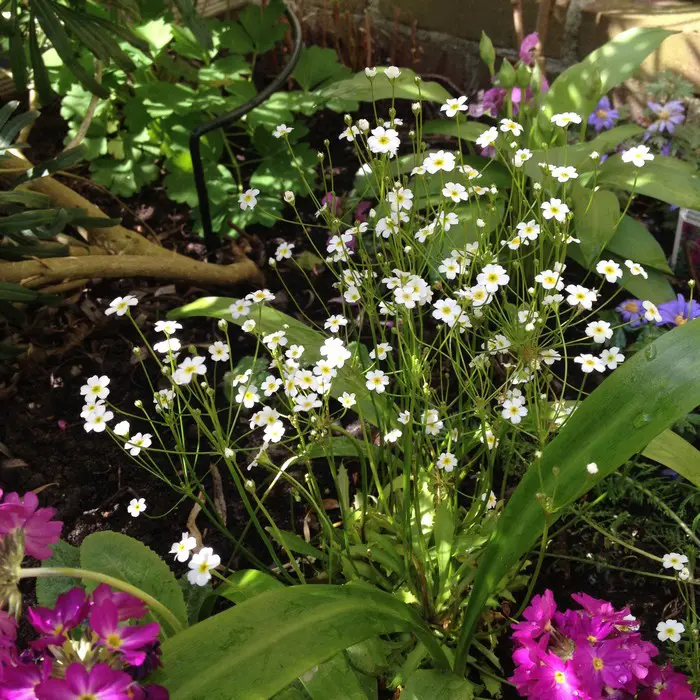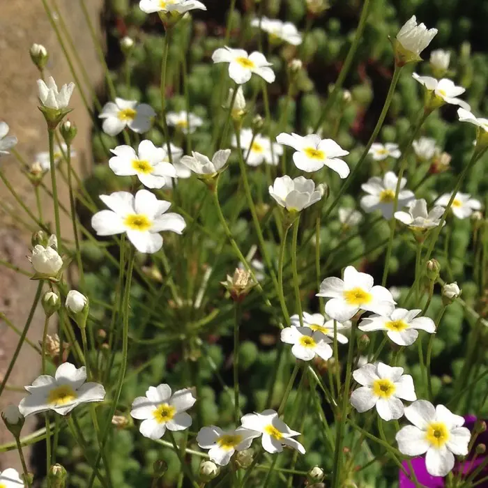 Androsace septentrionalis 'Stardust' forme une rosette de feuilles gris-vert foncé avec des fleurs blanches semblables à des ombelles, avec un œil verd-jaune sur de longues tiges.