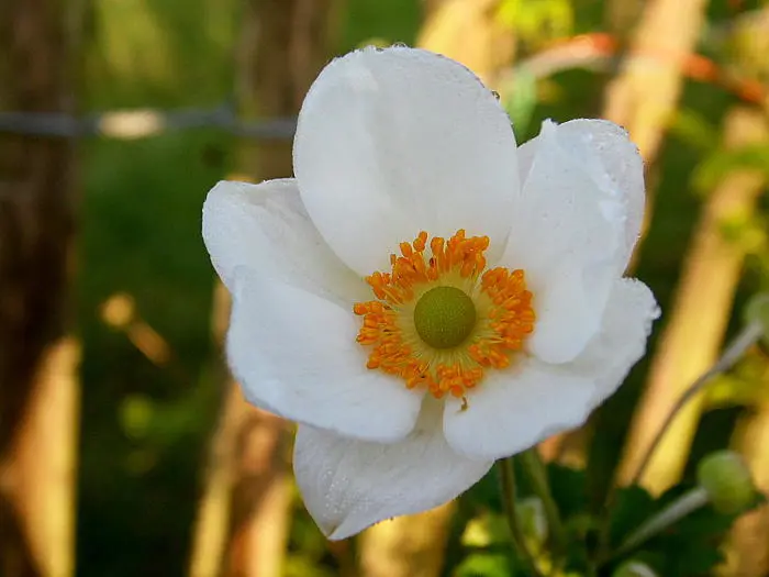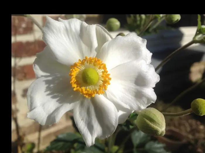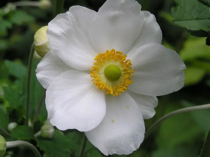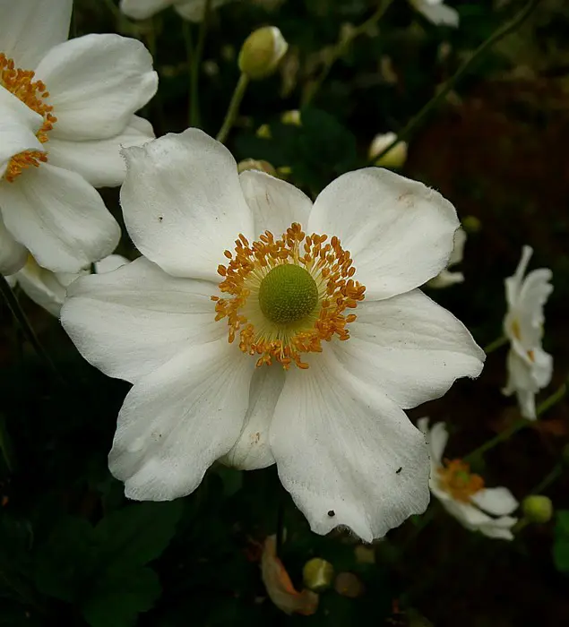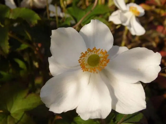 L’anémone 'Honorine Jobert' fleurit sur des tiges hautes avec des fleurs blanches et éclatantes, légèrement plus roses sur le dos et avec de longues étamines jaunes.
