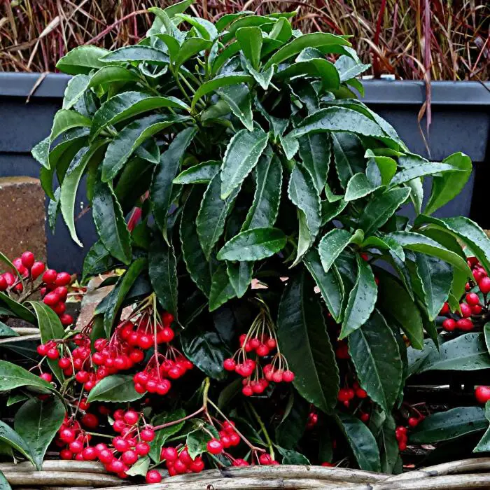 Ardisia crenata 'Queen Star' (PBR) forme un arbuste aux belles feuilles vertes brillantes et aux petites fleurs parfumées en été. Mais même en hiver, la plante reste attrayante lorsque les grappes de baies rouges apparaissent.