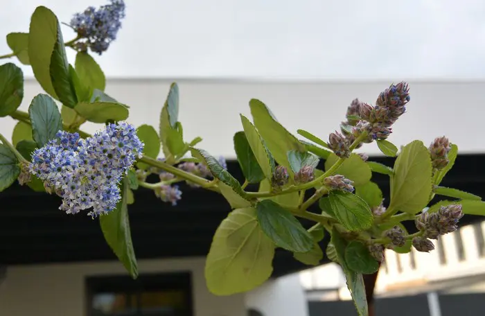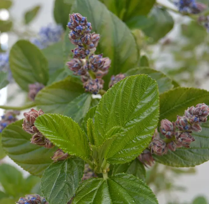 Ceanothus arboreus 'Trewithen Blue' de Californie (États-Unis) fleurit vraiment magnifiquement et richement avec des grappes florales lilas bleu maïs de 12 cm de long. Les feuilles sont d’un vert émeraude brillant et ovales.