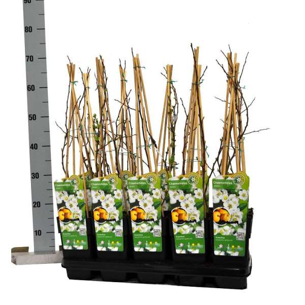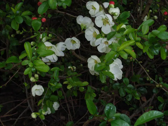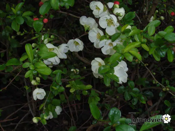 Chaenomeles speciosa 'Nivalis' est originaire de Chine et du Japon. C’est un arbuste vigoureux qui fleurit au début du mois de mars avec des grappes de fleurs blanches. Ils fleurissent avant que les feuilles vert foncé brillantes n’apparaissent.