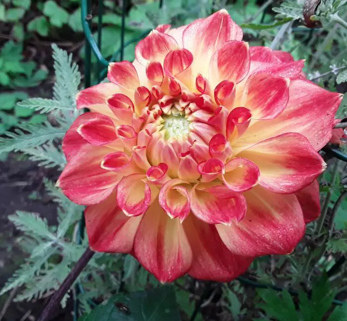 Le dahlia « Jowey Cherbourg » est un dahlia décoratif aux fleurs bien remplies et aux larges pétales rouges plats avec des stries jaunes et des pointes jaunes.