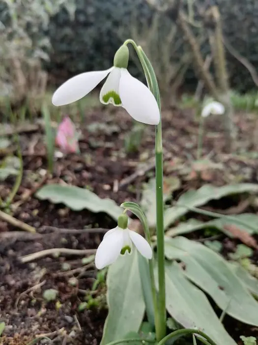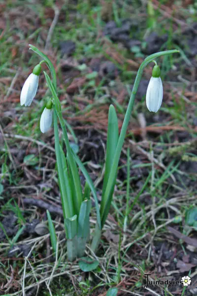 Galanthus nivalis 'S. Arnott' est une vivace sphérique aux feuilles fines gris-vert.