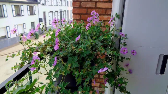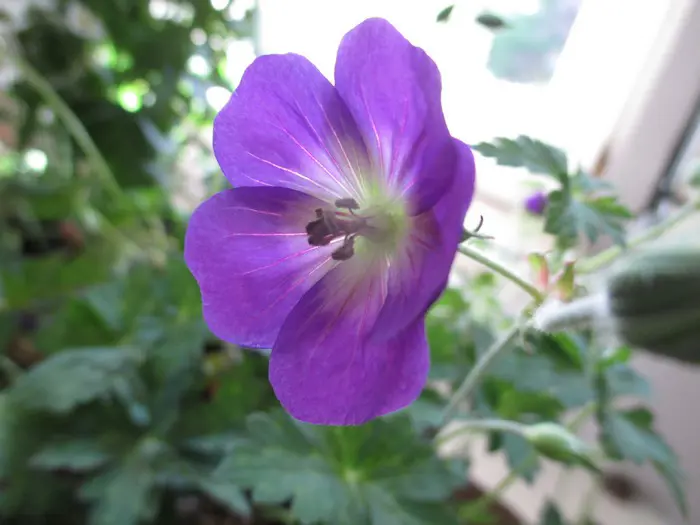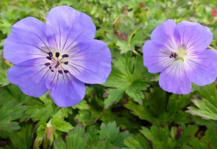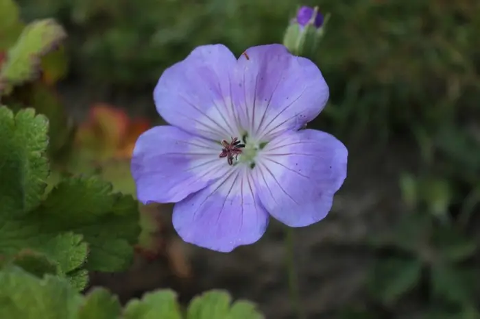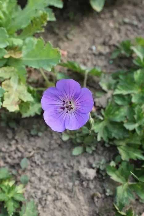 Le géranium 'Azure Rush' est un hybride du géranium 'Rozanne', mais il devient plus compact et fortement ramifié. Les feuilles sont fortement incisées, vertes avec une marque pâle et violette.