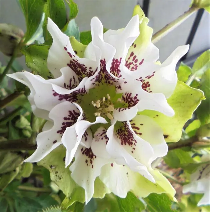 Helleborus orientalis 'Double White Spotted' est à double fleur avec des pétales blancs tachetés de rouge violet.