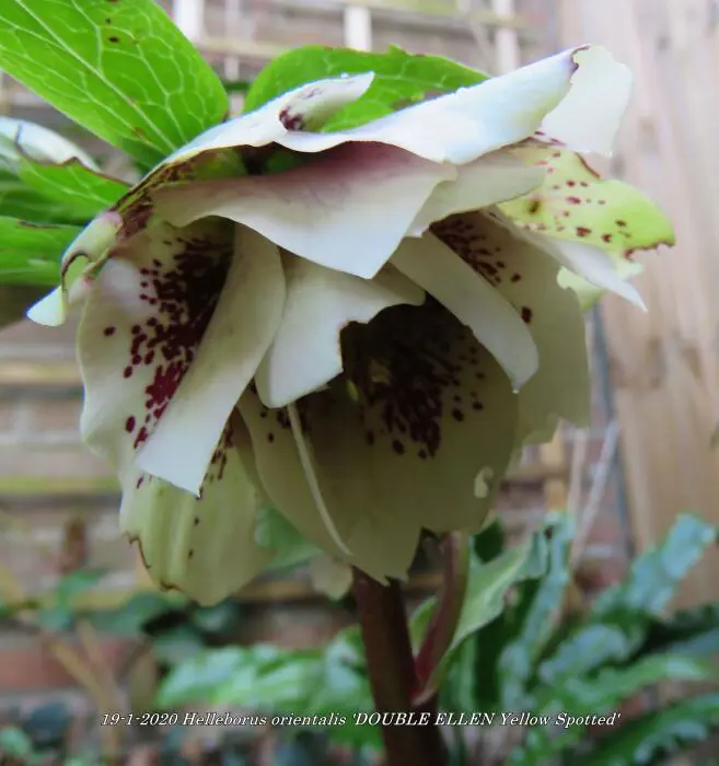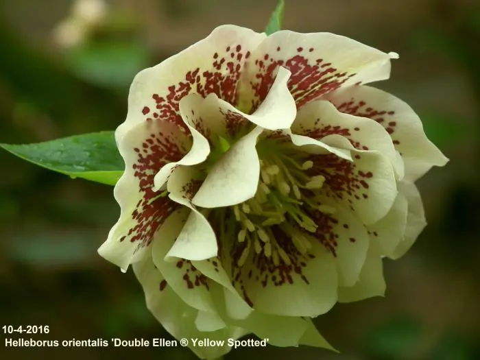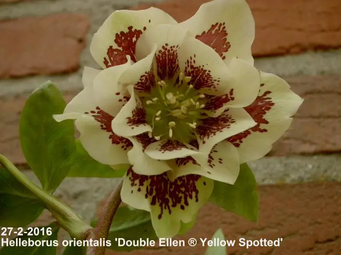 « Double Ellen ® Yellow Spotted » fleurit d’un jaune crème avec des taches brun-rouge au centre.