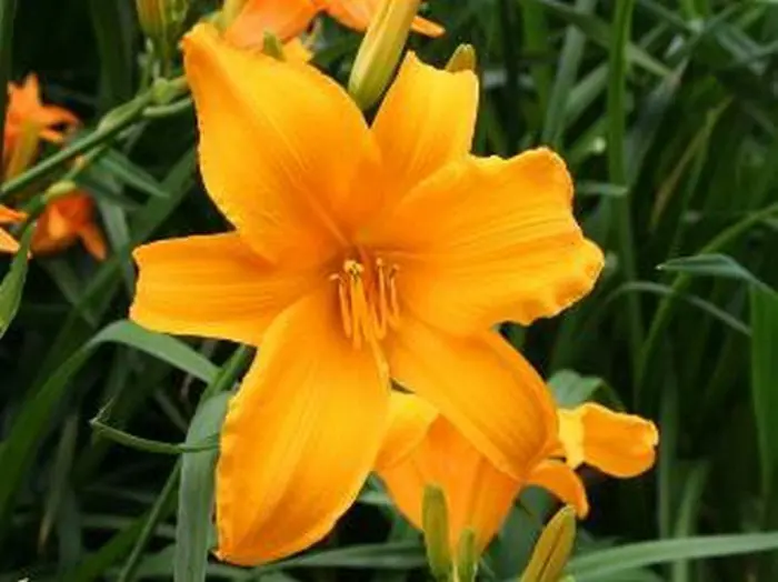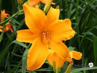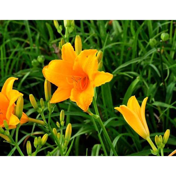 Hemerocallis 'Aten' fleurit avec des fleurs orange pur, puis refleurit en automne.