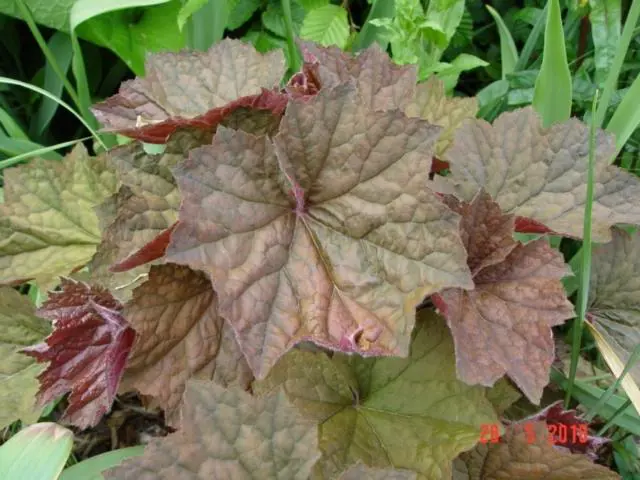 Heuchera 'Brownies' (groupe Villosa) a des feuilles plus grandes. Fleurs avec des fleurs fines d’un blanc crème sur de longues tiges qui se combinent magnifiquement avec les feuilles brunes/violettes.