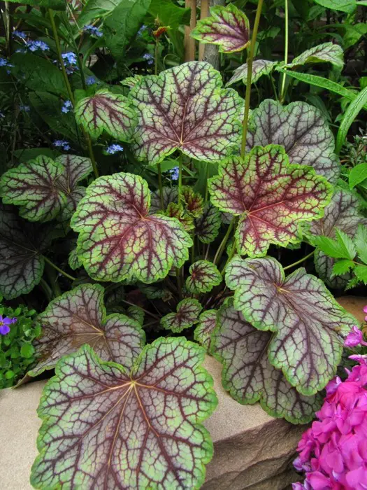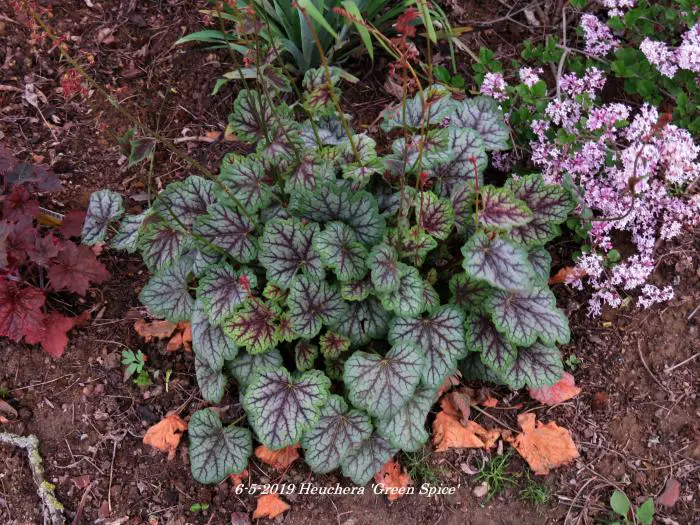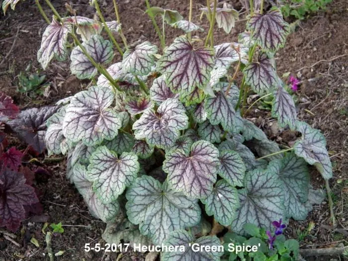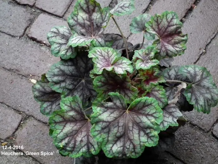 Heuchera 'Green Spice' présente une feuille très marquée et panachée verte et blanche avec des veines violettes.