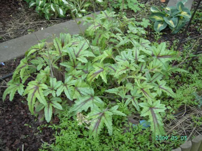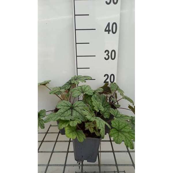 Les feuilles de x Heucherella 'Kimono' sont palmées, profondément incisées, argenté-gris/vert avec des nervures brun-violet.
