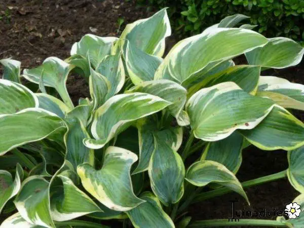 Hosta 'Glacier de la vallée' a des feuilles bleues en forme de cœur avec un bord jaune très large qui devient plus crème plus tard dans la saison.