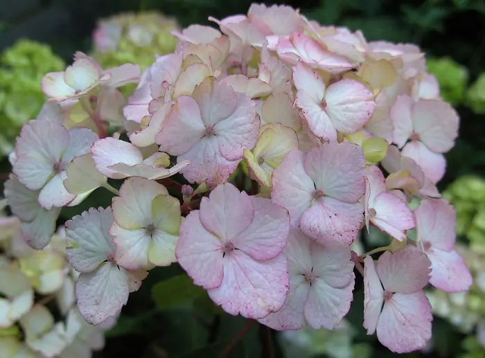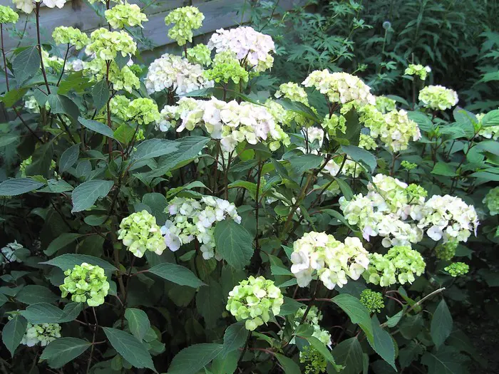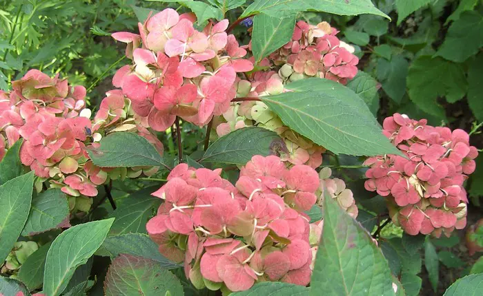 L’hortensia serré 'Preziosa' fleurit avec des fleurs ressemblant à des floks.