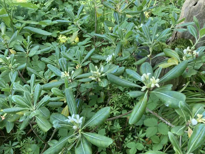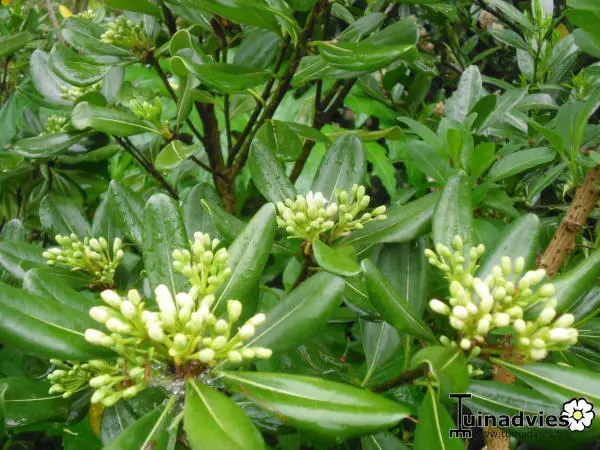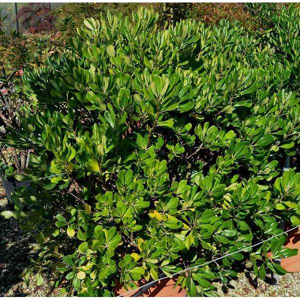 Pittosporum tobira est un arbuste à grande croissance à fleurs, avec des fleurs blanches/jaunes crémeuses et parfumées d’orange.