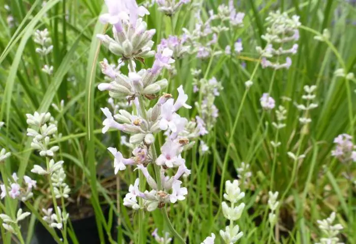 Lavandula angustifolia 'Rosea' est une lavande à fleurs rose pâle avec des feuilles grises aromatiques.