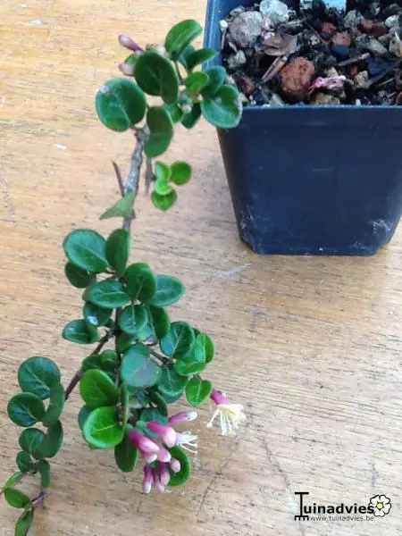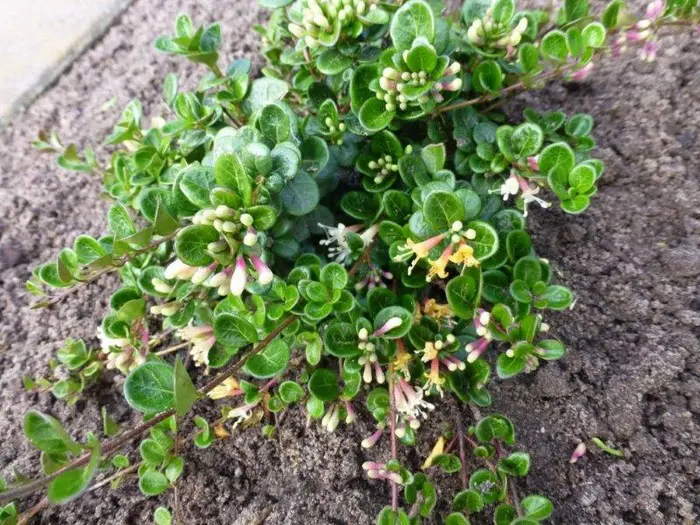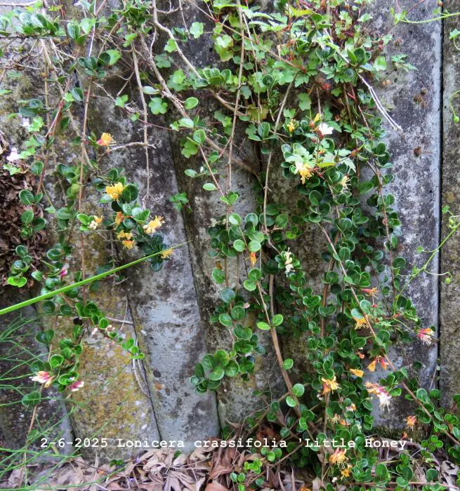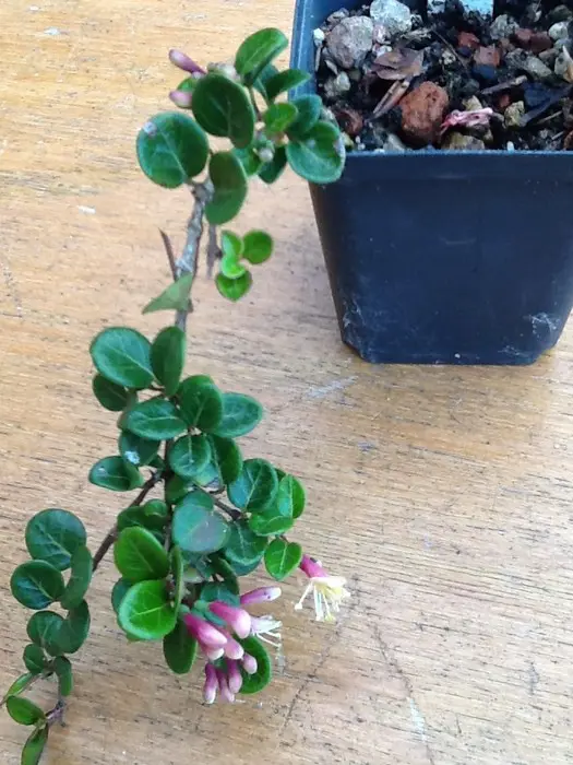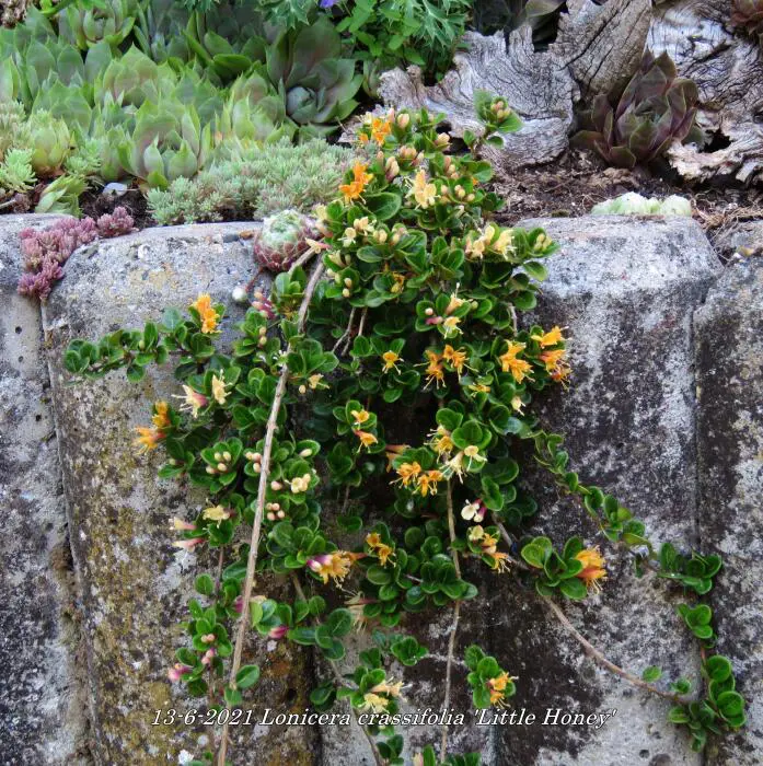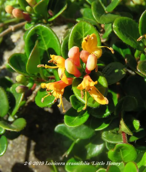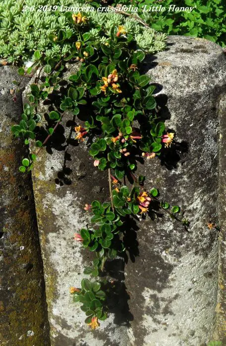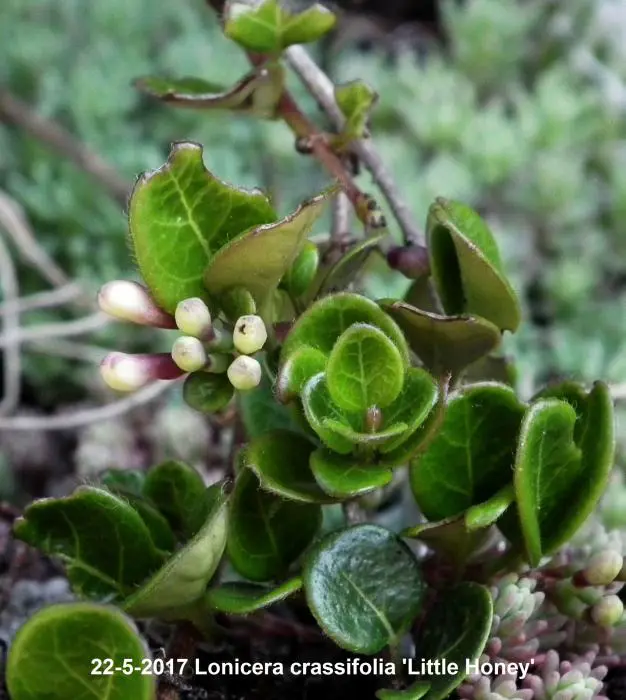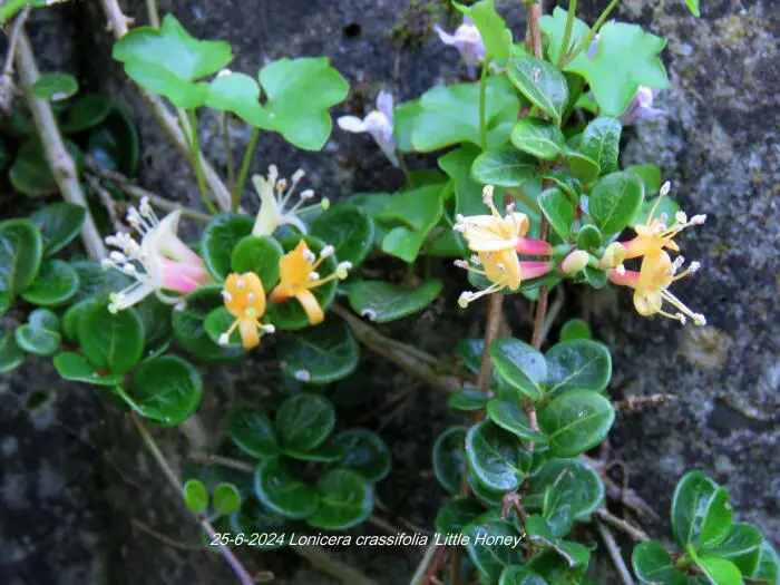 Lonicera crassifolia 'Little Honey' est un petit chèvrefeuille rampante aux feuilles rondes vertes brillantes et aux fleurs roses/jaunes crémeux, suivies de baies violettes.