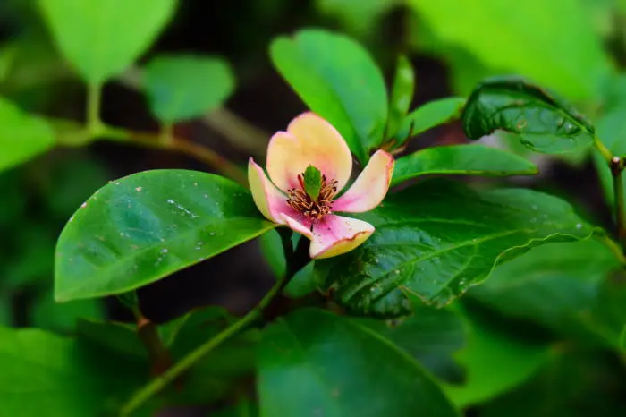 Le magnolia figo est un mini magnolia originaire de l’ouest de la Chine, avec des feuilles et des fleurs brillantes et cuirassées parfumées à la banane. Les fleurs fleurissent entre avril et juin, sont d’abord violettes et deviennent crème.