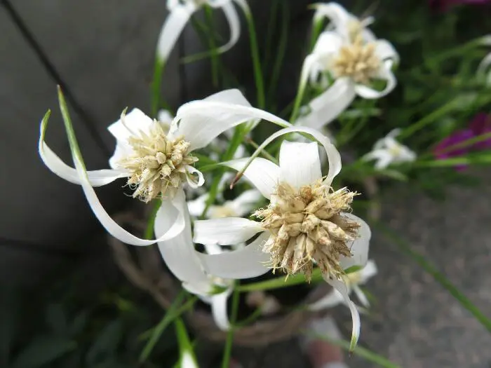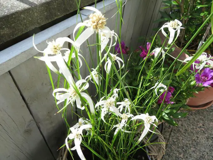 L’inflorescence a la forme de 1 à 3 épilettes blanches qui deviennent ensuite brunes.