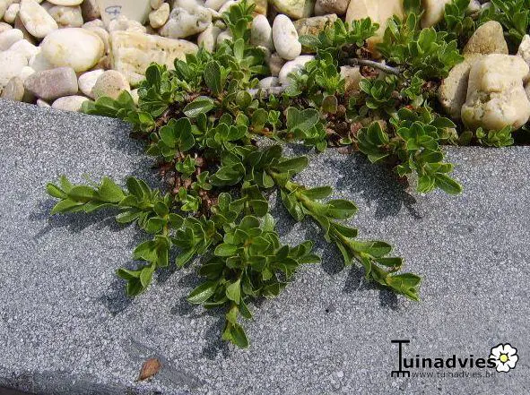 C’est un semi-arbuste recouvre le sol de 3 cm de haut qui forme un tapis dense composé de petites feuilles ovales brillantes.