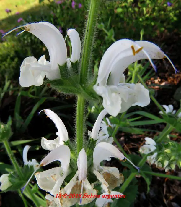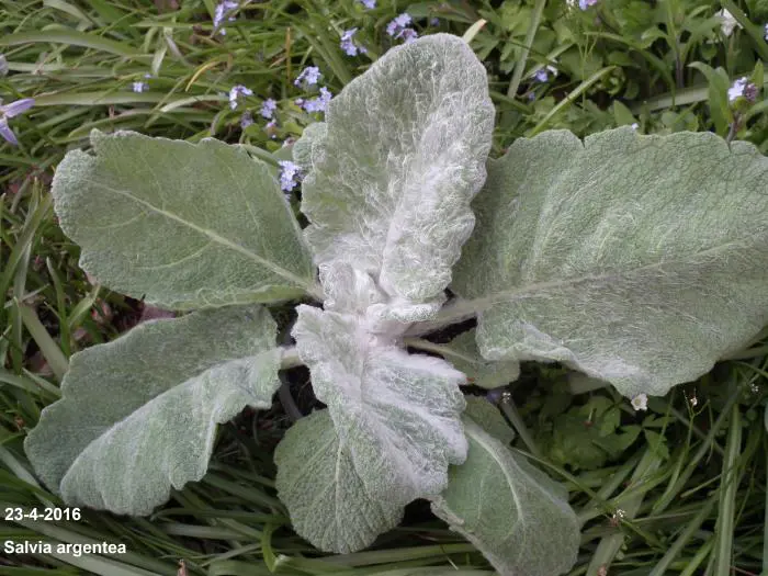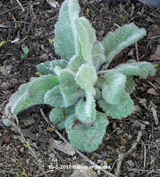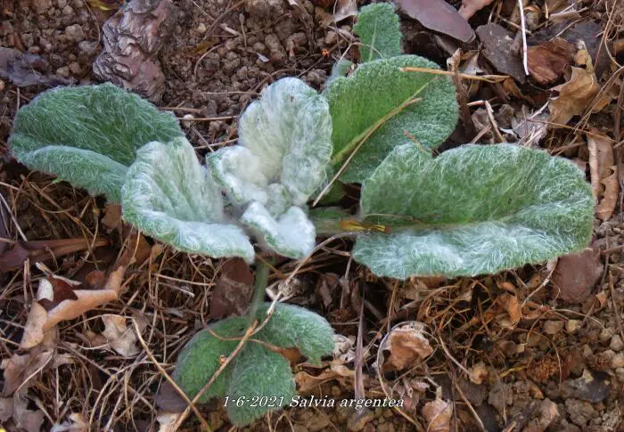 La végétation de la Salvia argentea est plutôt biennale, mais elle se comportera comme une vivace à courte durée de vie si l’on évite la formation de graines. En un temps record, la plante forme une large rosette de 50 à 60 cm, composée de grandes feuilles ovales, avec des bords crénelés et ondulés, entièrement recouverte d’un long duvet argenté. Le feuillage atteindra une hauteur de 20 à 30 cm, pour un diamètre d’environ 60 cm.