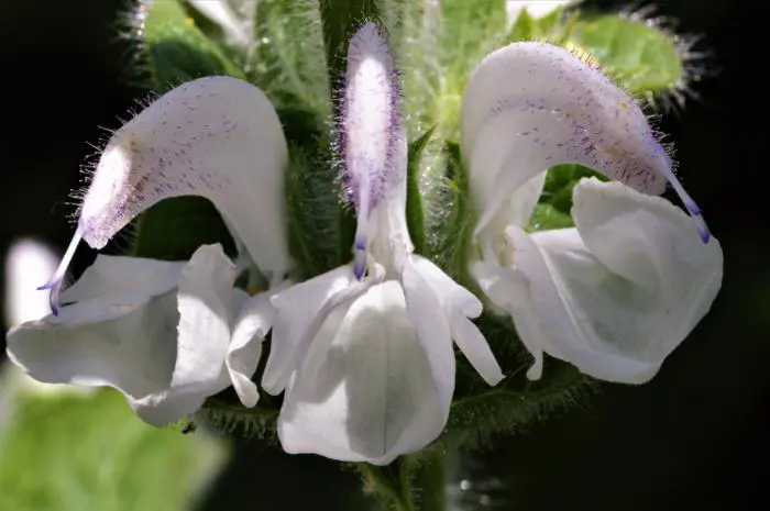 La floraison, le nectar et le miel apparaissent durant la deuxième année de culture. Les tiges florales, hautes de 70 à 80 cm, sont ramifiées. Ce sont des tiges en section carrée, avec des fleurs blanches, composées de deux lèvres blanches.
