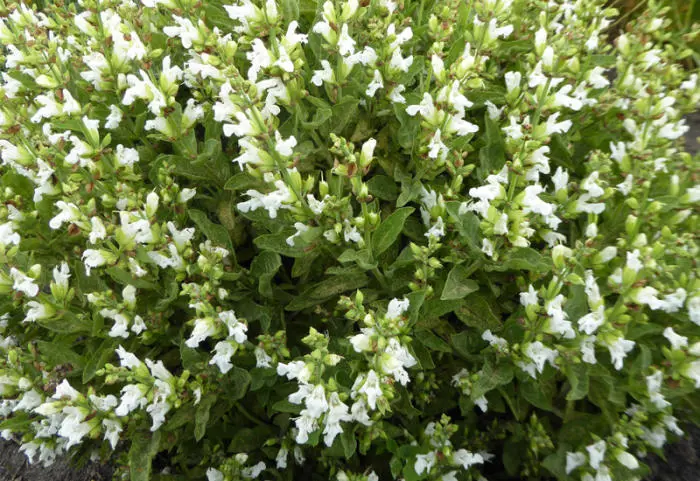 La Salvia officinalis 'Albiflora' est une plante vivace au tempérament compact et aux feuilles aromatiques, ovales gris-vert et allongées.