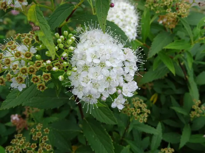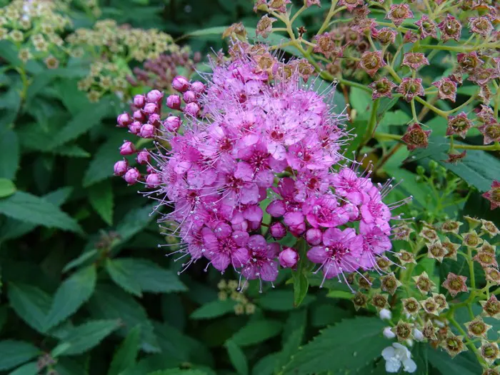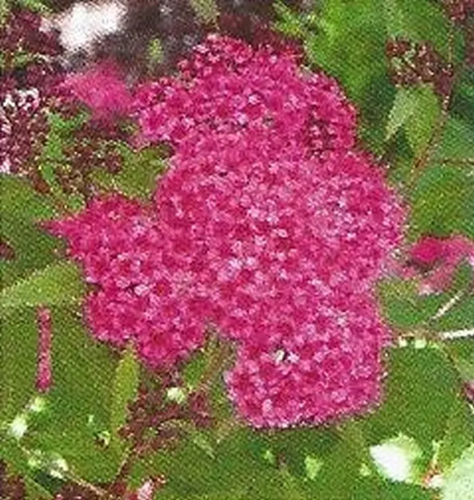 Spiraea japonica 'Genpei' est un arbuste compact et robuste avec des feuilles lancéolées, vert clair à vert foncé, teintées d’orange chaud en automne.