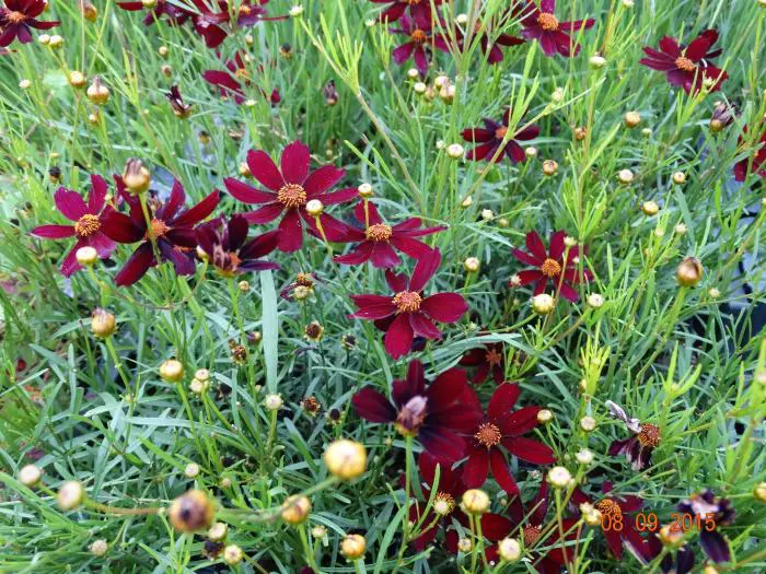 Tout au long de l’été, des fleurs rouge vin foncé, semblables à des marguerites avec un œil orangé, fleurissent sur de longues tiges dressées.