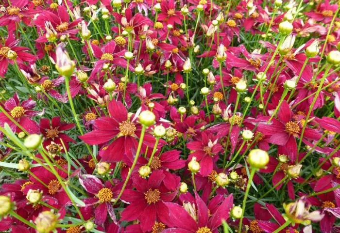 Coreopsis verticillata 'Red Satin' est une vivace compacte formant des collines, avec des feuilles vert foncé finement divisées.