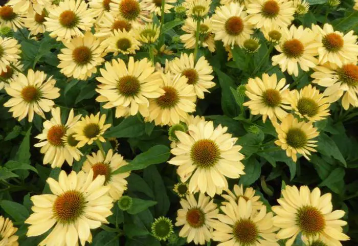 Les pétales sont jaune paille autour d’un cône brun-orangé.