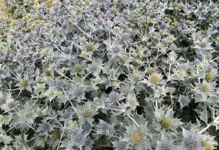 Des fleurs avec des têtes rondes bleu métallique semblables à des chardons, entourées d’un collier argenté et pointu.