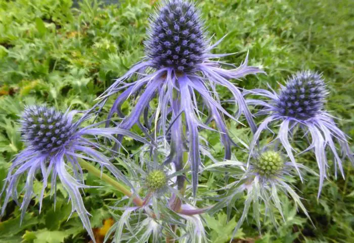La fleur ressemblant à un chardon se compose d’une bractée épineuse violet-bleu autour d’une humbellère conique violet-bleu sur des tiges bleu-violet foncé.