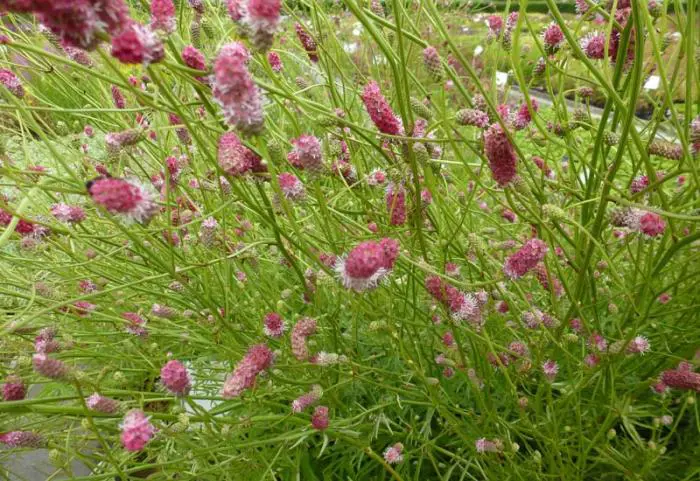 Sanguisorba tenuifolia 'Pink Elephant' sont des plantes bordières fortes avec des épines florales inclinées et des feuilles composées.