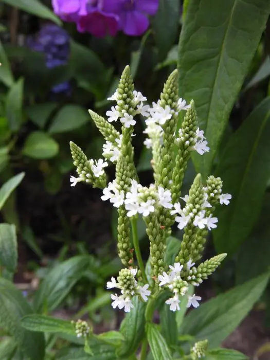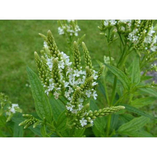 Verbena hastata 'White Spires' est une vivace herbacée haute avec une floraison exceptionnellement longue composée de chandeliers fins et ramifiés, formés de pointes droites, densément couvertes de petites fleurs blanches.