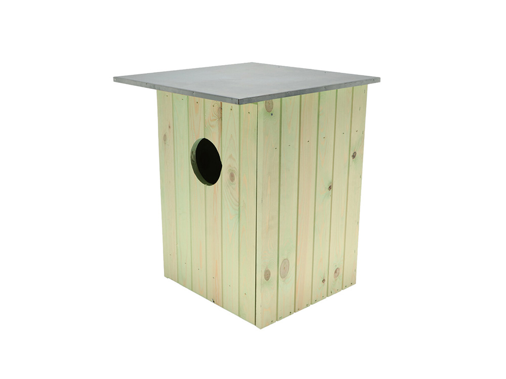 La boîte à nids est faite de bois imprégné pendant une longue durée de vie, avec du bois provenant de forêts gérées de manière durable. Le toit est revêtu de zinc pour le protéger des conditions météorologiques défavorables. Un endroit approprié pour accrocher la boîte est un endroit calme et quelque peu abrité sur un arbre à une hauteur de 3 à 5 m, donc pas directement au soleil ni du côté de la pluie, avec une trajectoire de vol libre pour les chouettes fauves.
