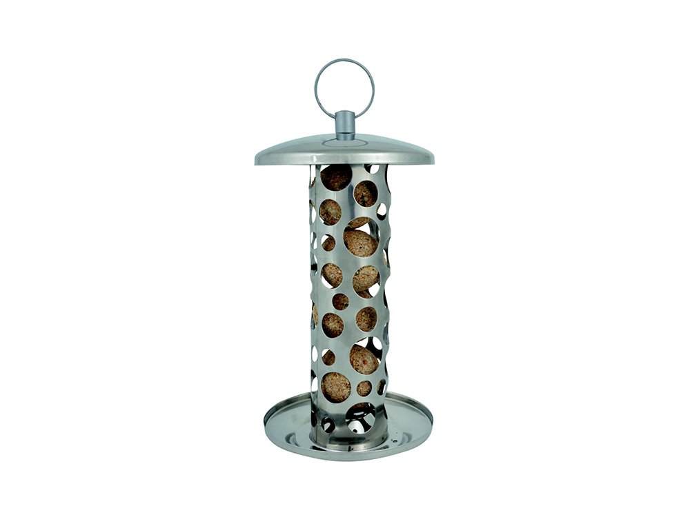 Machine à grosses boules modernes et élégantes d’Esschert Design en acier inoxydable. Ce distributeur automatique peut accueillir 4 à 5 boules de graisse et convient aux boules de graisse sans filet. Un grand avantage de cette machine est qu’elle empêche de grands oiseaux comme les choucas et les pies de s’enfuir avec des boules entières.