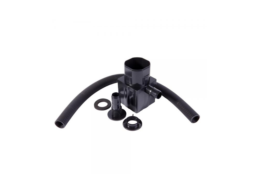 La pièce d’accouplement est reliée au baril de pluie par un tuyau flexible en plastique de 50 cm de long et une vanne de connexion installée sur le côté du barillet. Certains canons sont déjà pré-percés, avec d’autres modèles on perce soi-même un trou (25 mm).