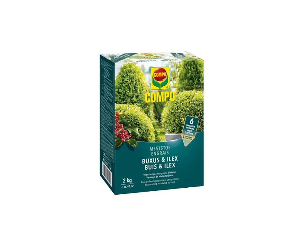 Compo Fertilizer Buxus & Ilex pour un bon développement de buis, Ilex, troène, haies, plantes persistantes, hêtres (de haie) et épine-vine. Elle garantit un développement sain des plantes, une croissance foliaire dense et des feuilles vert profond avec une forte résistance à la sécheresse.